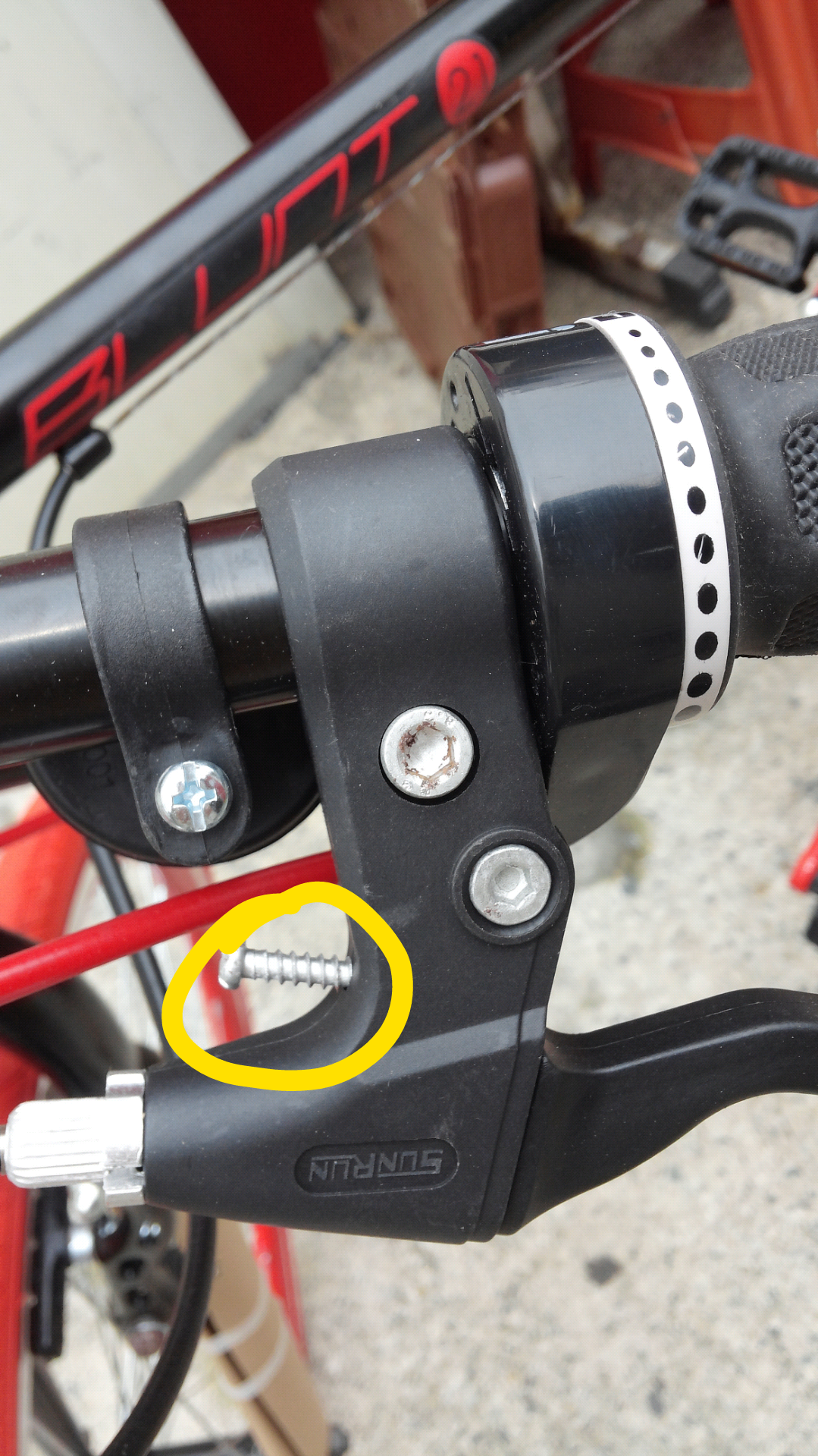 핸들 브레이크쪽에 (노란색 원) 볼트 뭐 하는 건에요? 엄청길게 나와있는데..