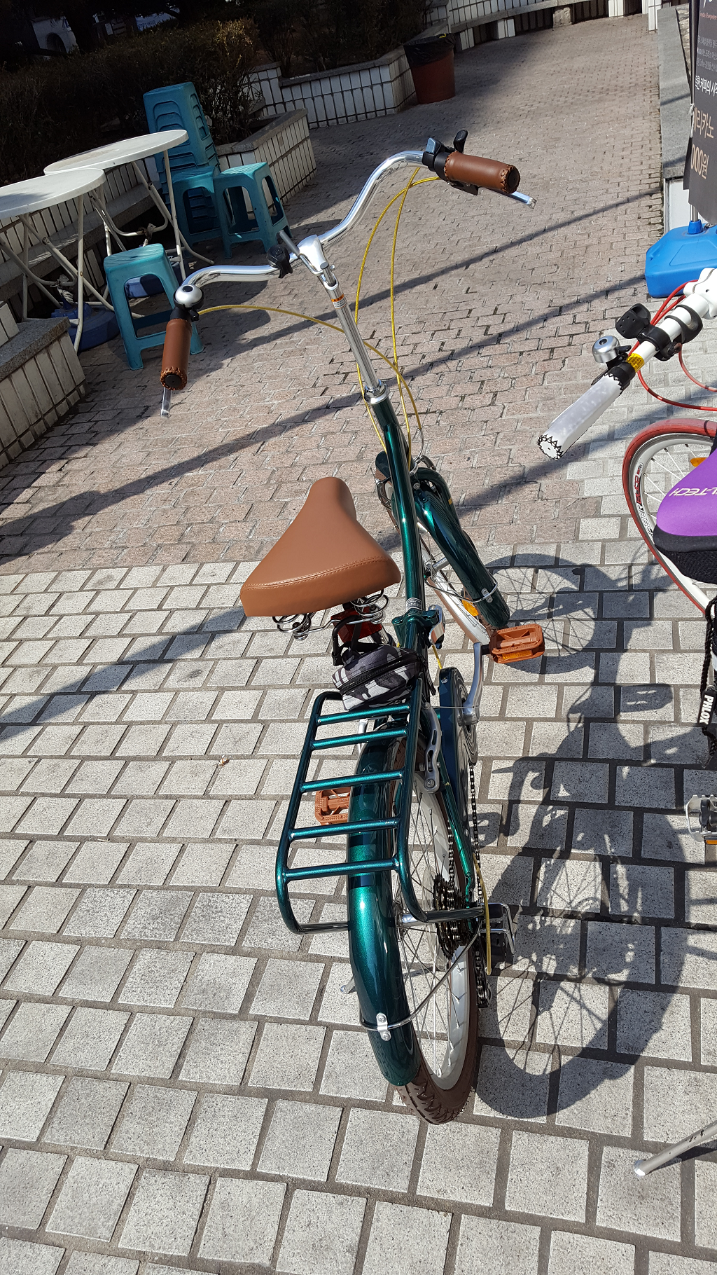손잡이도 안장도 가죽느낌으로 덧대서 고급지고 그린과도 잘 어울리네요. 기본 사은품으로 보내주신 것들도 유용하게 잘 쓰겠습니다.