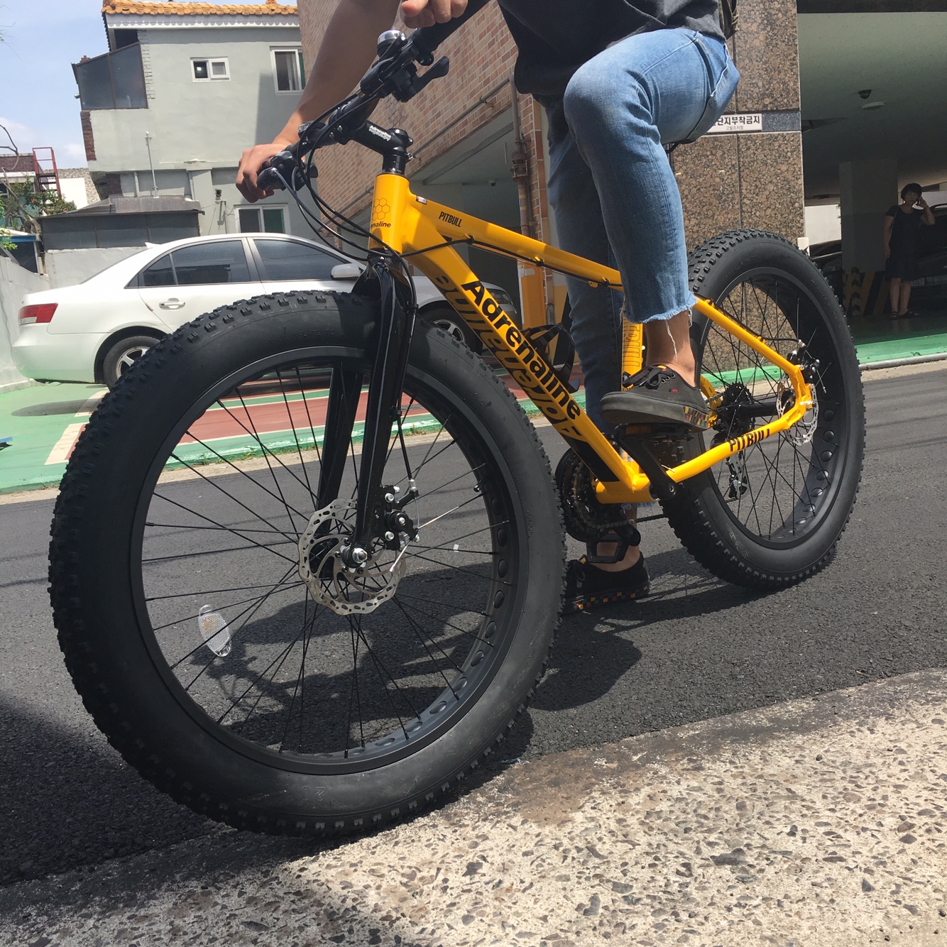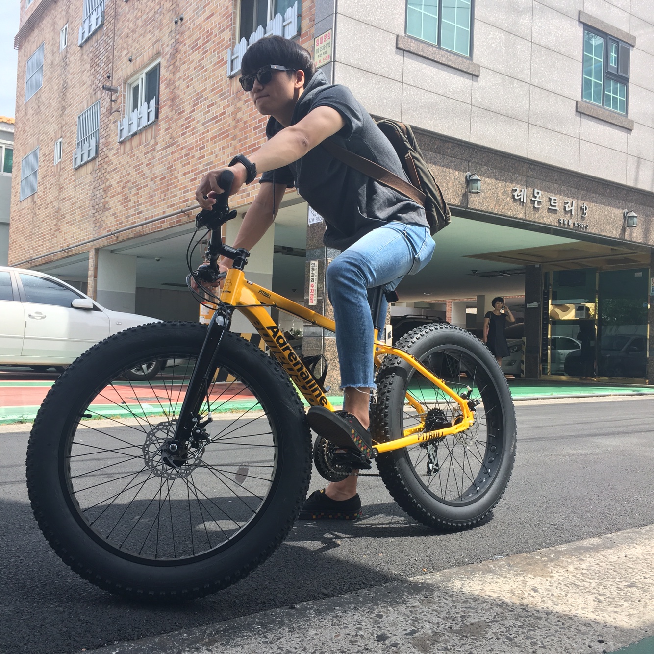 역시 눈에 잘보이는 노란색에 우람한 타이어까지 타고 나가니까 시선 집중이네요 출퇴근용으로 산거지만 완전 멋진 관계로 주말에도 타고 다닐듯요 ㅎㅎㅎ 아 참 사은품으로 자물쇠 주세요오오