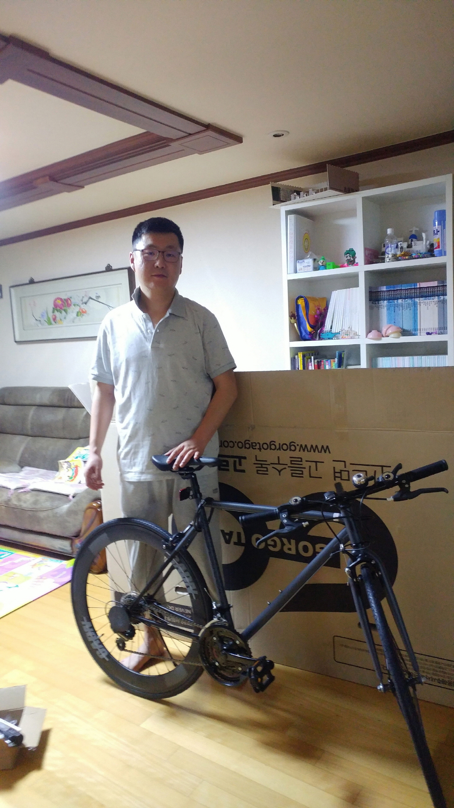 사진의 정석이죠. 고르고타고 박스앞에서 자전거와 고객님! 크으
