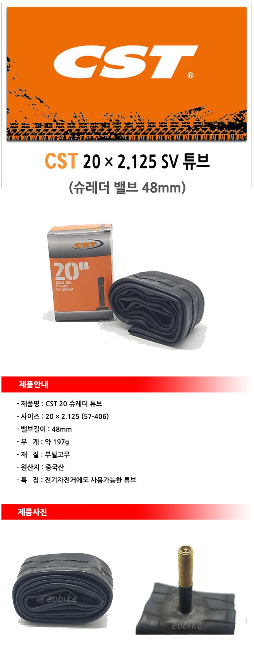 CST 20 x 1.75 - 2.125 인치 자전거 튜브 슈레더 48mm