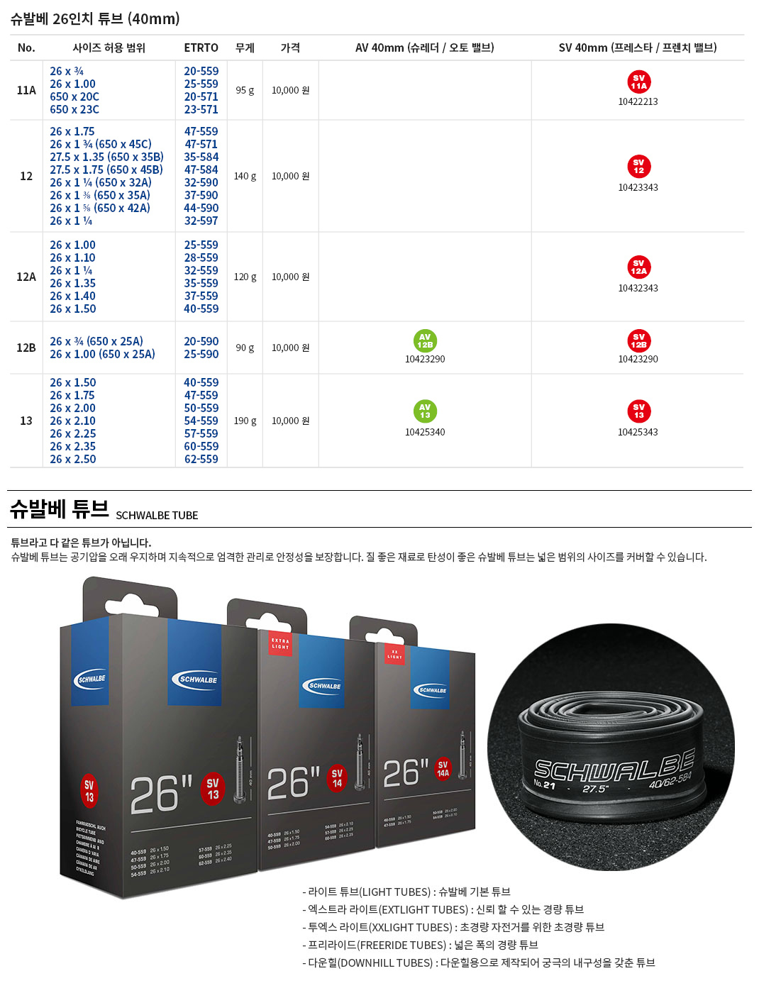 슈발베 26인치 라이트 튜브 프레스타 슈레더 40mm밸브