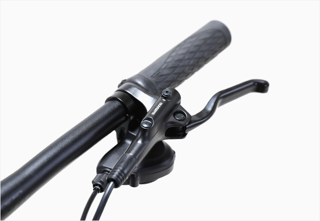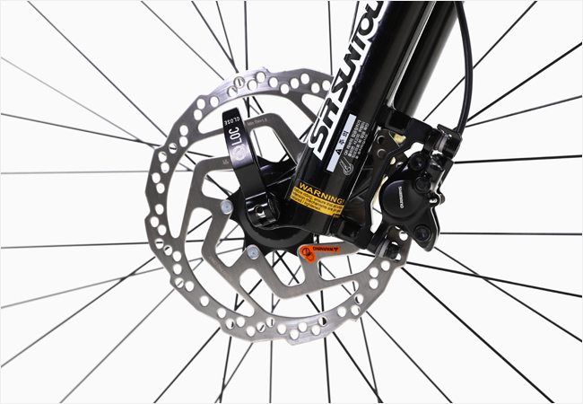 제동 시스템은 시마노 유압식 디스크 브레이크 세트로 구성되어 있으며,