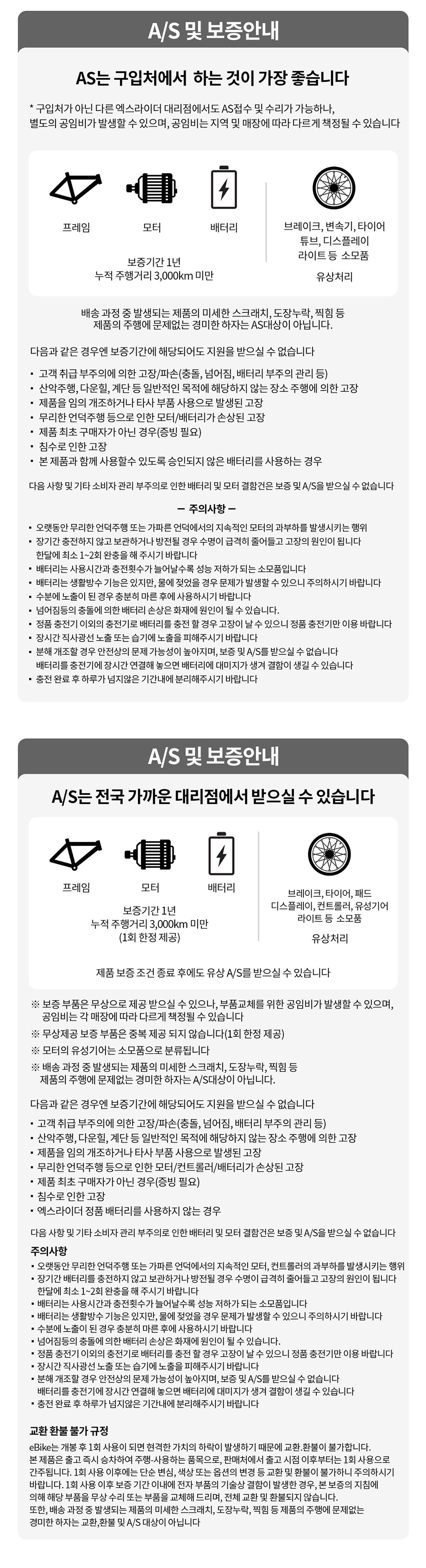 A.무상수리 : 구매일로부터 차체 1년, 부품 6개월(소모성 부품제외)