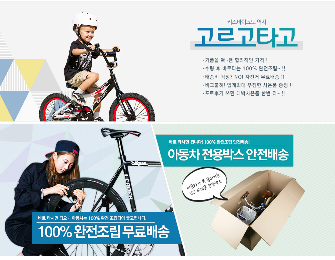 조립되지 않은 미조립상태로 고객님께서 수령하신 때에는 반드시 자전거샵에서 조립하셔야합니다. 근처샵에서 조립하실 수 있도록 제품에 따라 일정금액만큼을 할인해드리며, 조립시 발생한 파손/불량문제에 대해서는 자사에서 책임지지 않습니다.